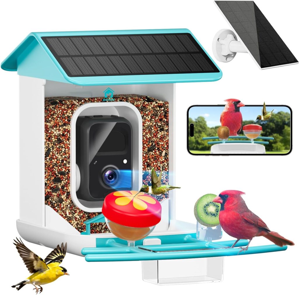 A smart bird feeder with camera is an outdoor bird‐feeder unit integrated with a Wi-Fi or wireless camera (often HD or 2K), connected to a mobile app. It captures live video or stills of visiting birds, sends notifications when a bird lands (thanks to motion sensors), may include AI species recognition, and often uses solar or rechargeable power for outdoor use.